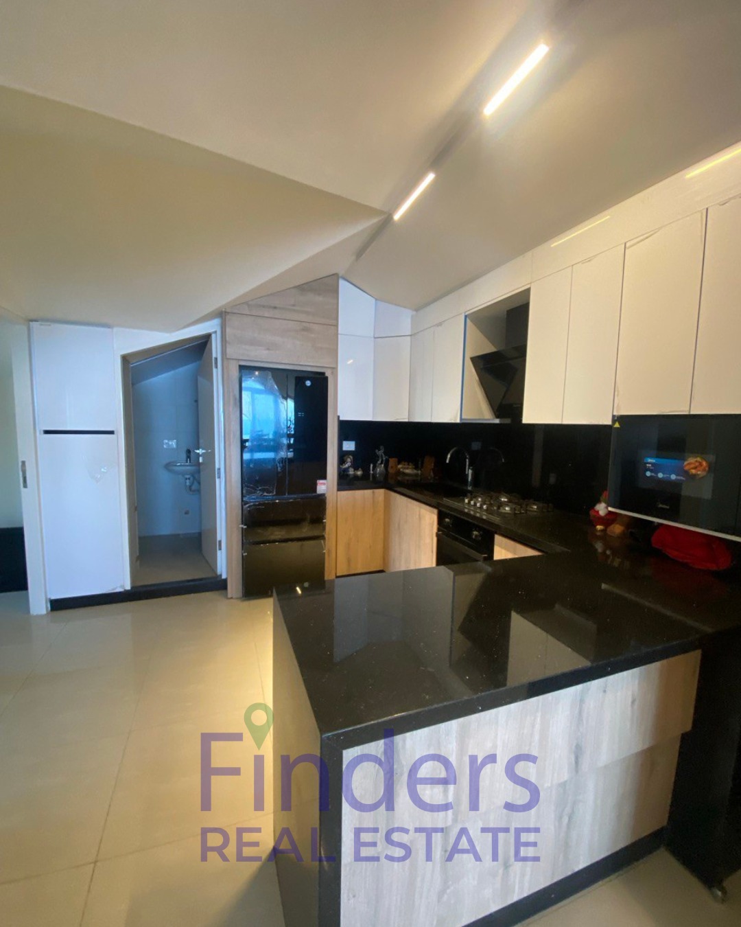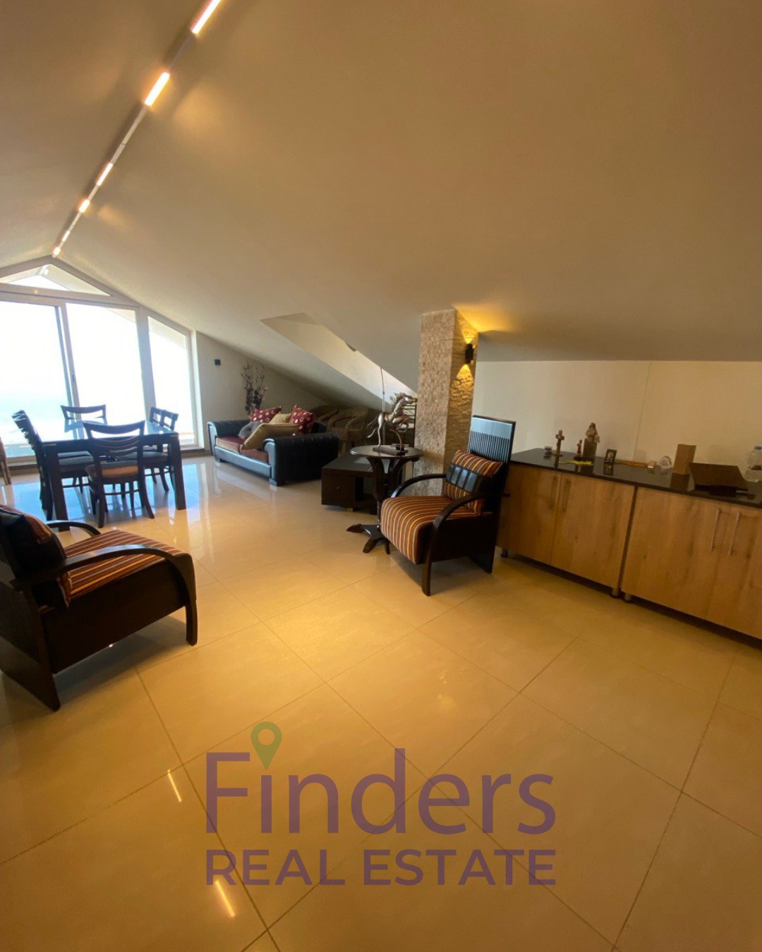 This fully furnished rooftop apartment has a total area of 135 sqm with a low ceiling. It is located on the 5th floor and offers a beautiful open mountain and sea view.